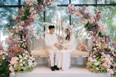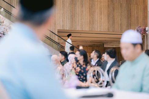 Following their heartfelt first look, the couple proceeded to the nikah area for the solemnization ceremony. The space was adorned with vibrant decorations, bathed in the soft, natural light pouring through large windows, all masterfully set up by the Mahligai Creative team. Family and friends began filling up the chairs in the theater area, eagerly awaiting the ceremony.