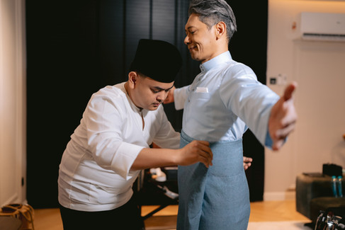Ezwan Zain complemented the bride’s regal presence in a soft grey traditional Malay ensemble, impeccably tailored and rich in heritage detail. A ceremonial keris, secured elegantly at his waist, reinforced the symbolism of leadership, protection, and responsibility, while layered silver accessories added depth. Styled by bysymrrsln, the groom’s overall look balanced dignity and restraint.