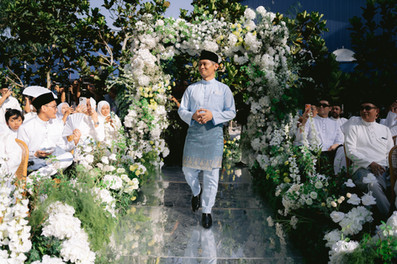 The ceremony began with bridesmaids presenting the mahr, golden flower, alongside a Cartier diamond ring valued at RM80,000, each symbolising responsibility, commitment, and honour. Groomsmen followed with the "hantaran", which are gold jewellery, handbags, wristwatch, shoes, and perfume. All items presented traditionally on "talam", reimagined with refined elegance.
