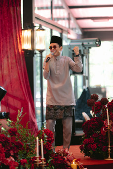 The reception commenced with the groom’s entrance. His presence set the tone, assured yet understated. Moments later, the bride made her entrance in a breathtaking procession. She was borne beneath an 'anjung diraja', a ceremonial canopy traditionally reserved for royalty, carried by four attendants. The bride then descended from the 'anjung' and moved towards her husband, who stood waiting for her. Together, they began their walk to the dais, united, unhurried, and resolute.